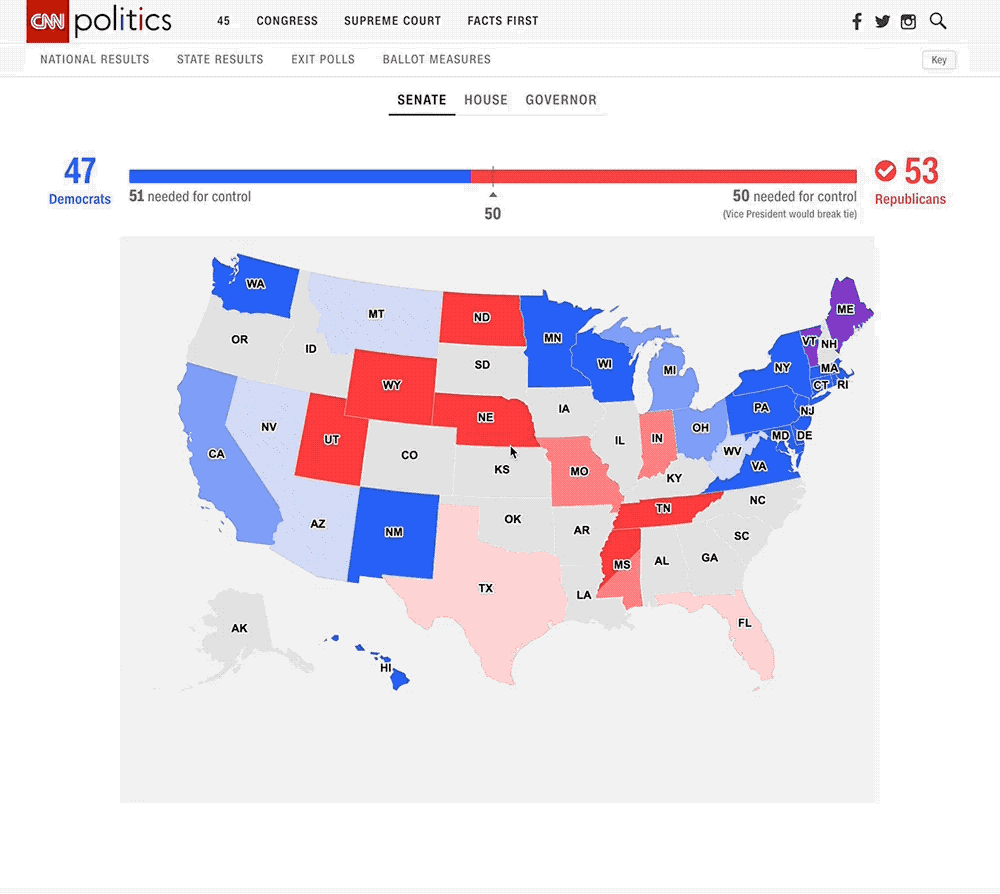 A midterm election is primarily focused on the two chambers of Congress, the Senate, and the House of Representatives. These two chambers often control the agenda and have a huge impact on the direction of the country. A third of the 100 seats of the Senate were up for election in 2018, and it was our responsibility to show the race as transparently and up to date as possible.